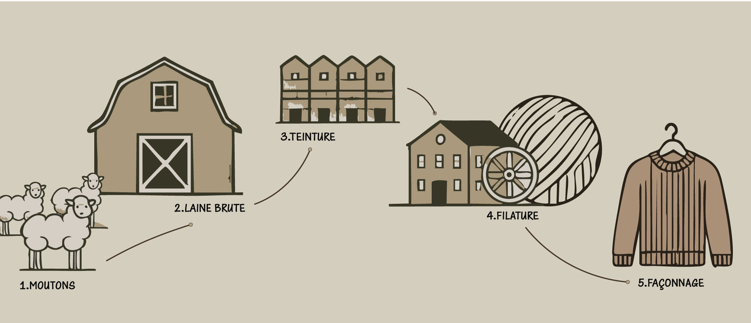 Le grand avantage de notre fournisseur de fils de laine est qu’il se fournit directement auprès des éleveurs sans passer par des intermédiaires, ce qui est très rare dans le milieu. Cette collaboration directe permet une traçabilité à 100% des fibres de laine et un contrôle continu des conditions d’élevage des moutons.
