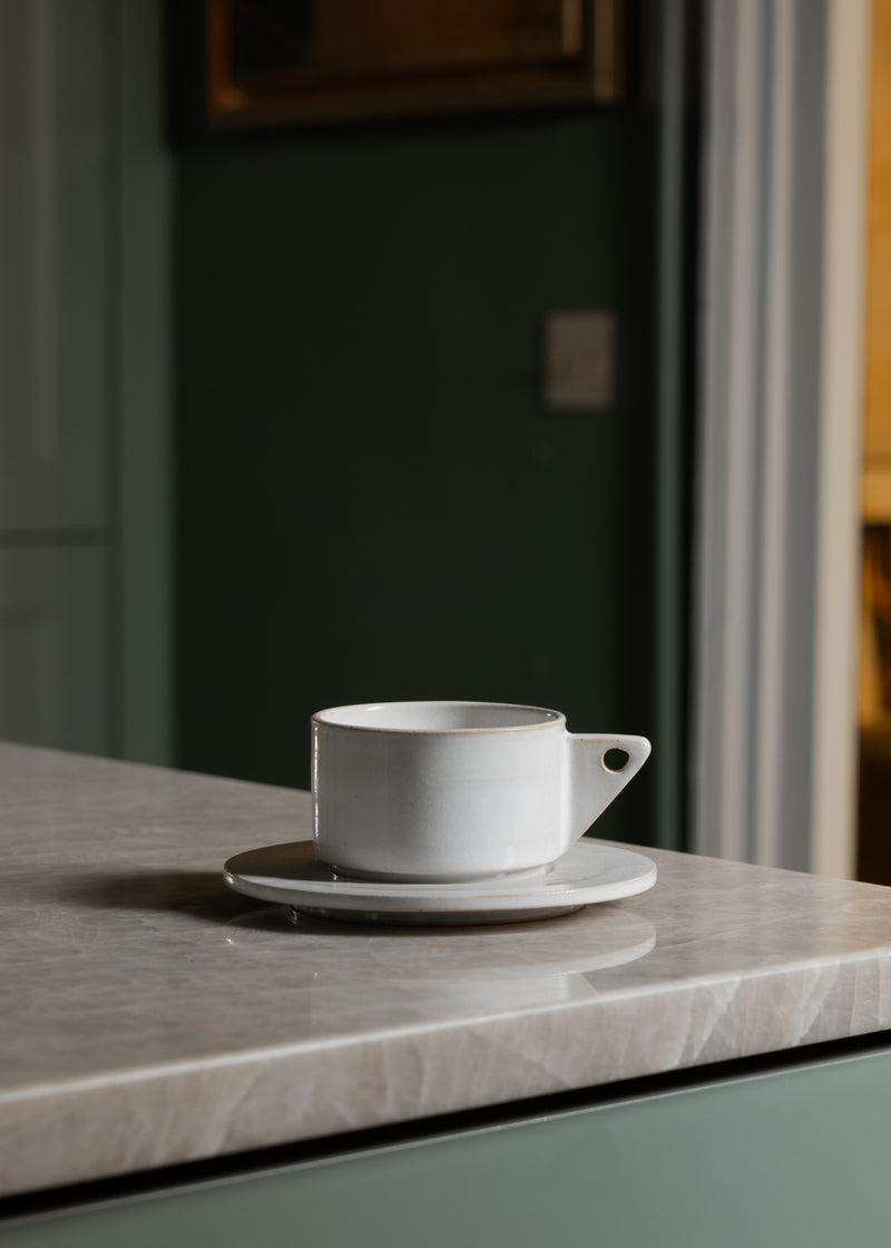 Idéale pour cafés allongés et matchas, tasse à café de taille moyenne, à bords droits avec une petite anse triangulaire. Soucoupe plate assortie.